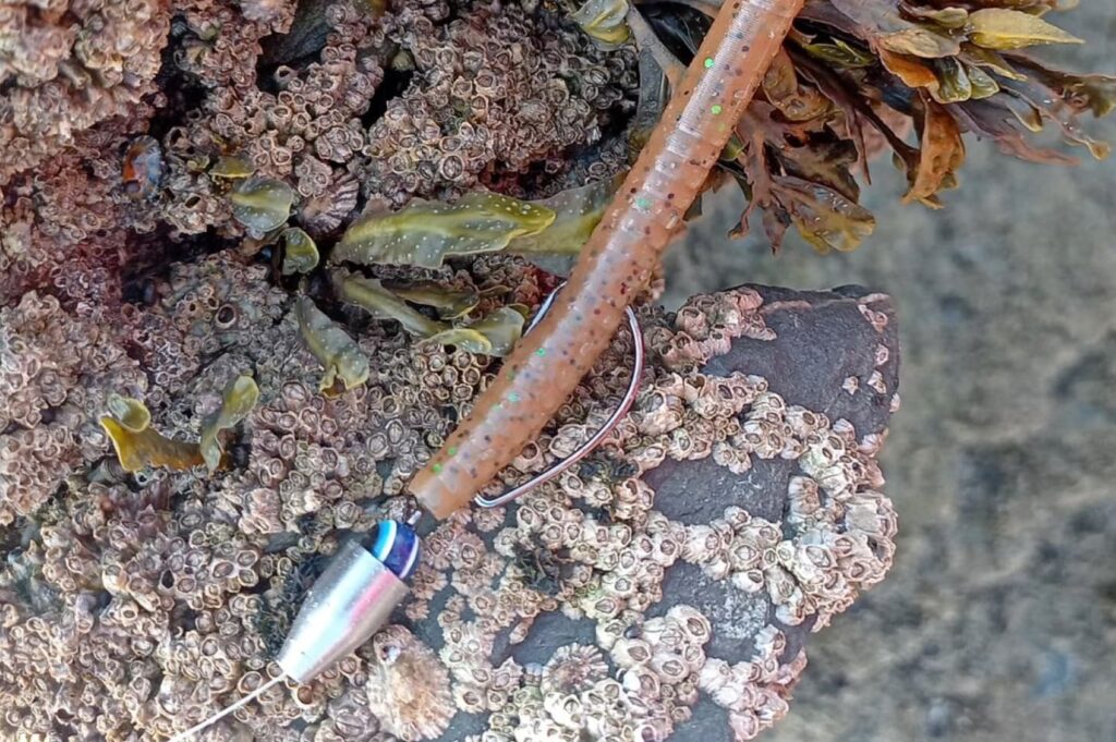 When using the Texas rig, I’ll always leave my cone weight free sliding with a glass bead inbetween the weight and the hook. This creates an audible clicking sound as the weight hits the bead against the hook, which will attract any wrasse in the vicinity that may not have seen your senko. I’ll always fish this rig with the lightest weight I can get away with, for two reasons. Firstly, the heavier the weight, the faster it will drop through kelp and in between boulders which can cause more snagging. Secondly, I like it to drop slowly through the water column, not just on the cast, but in between implementing flicks. The slower it drops, the more it will be in the strike zone of the wrasse. I’ve had many a fish strike as the lure was sinking after casting out. This slow, methodical retrieve is especially deadly in winter wrasse fishing when the fish can be more lethargic.